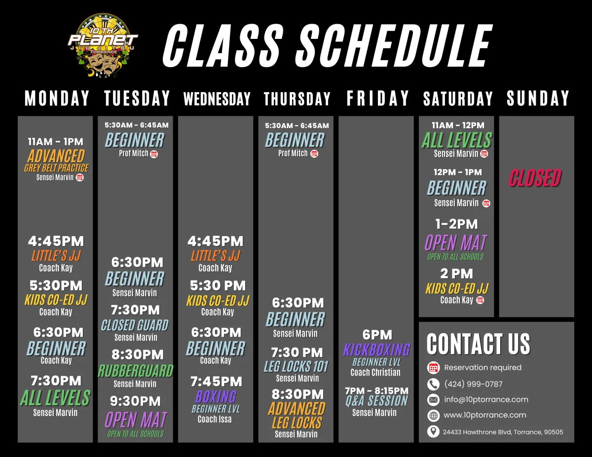 Please find the following class schedule, where the classes are color-coded according to different levels of experience.